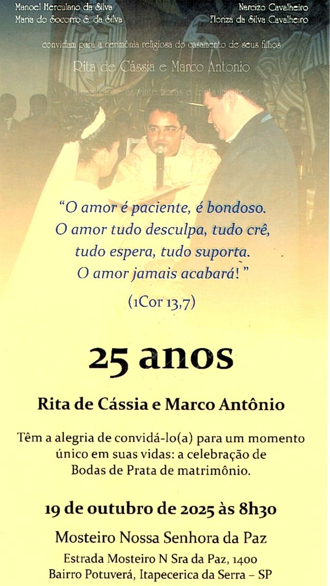 O matrimônio de Rita e Marco aconteceu em 21 de outubro do ano 2000 no Santuário Nossa Senhora dos Prazeres e Divina Misericórdia, presidido por Pe.Francisco Zeno (1968-2024).