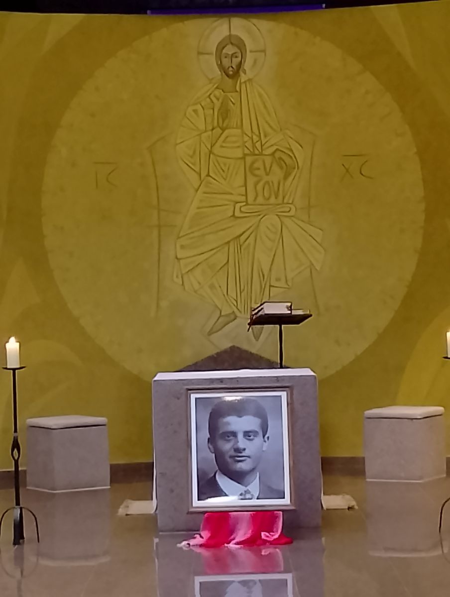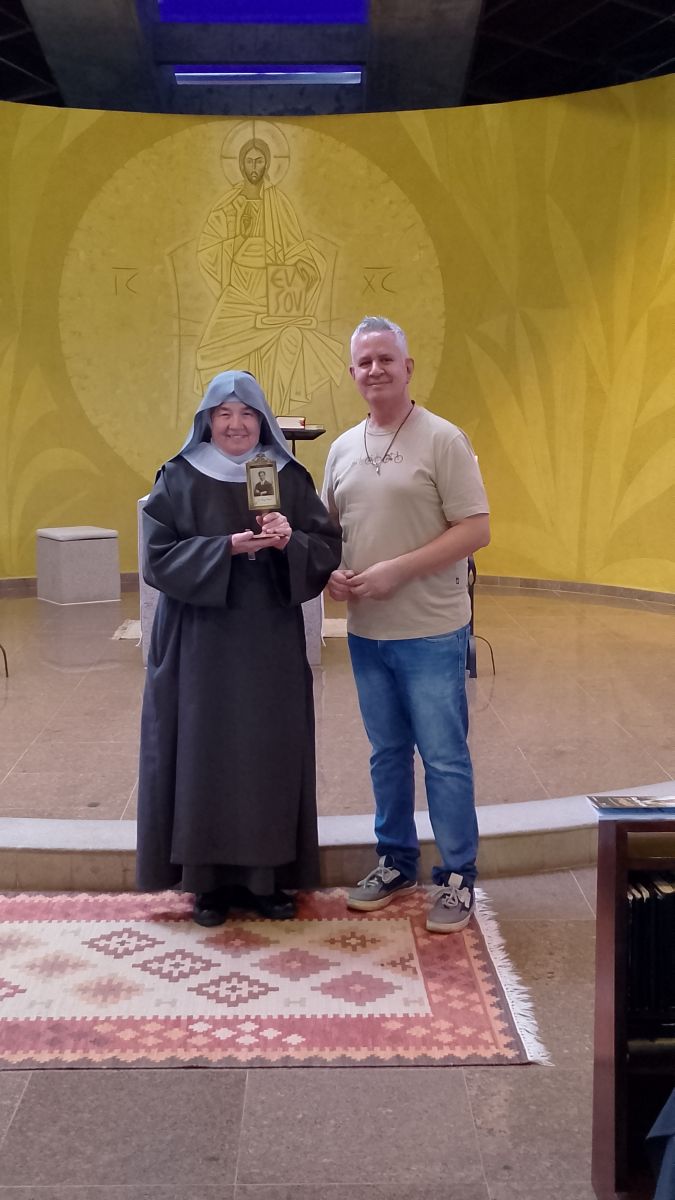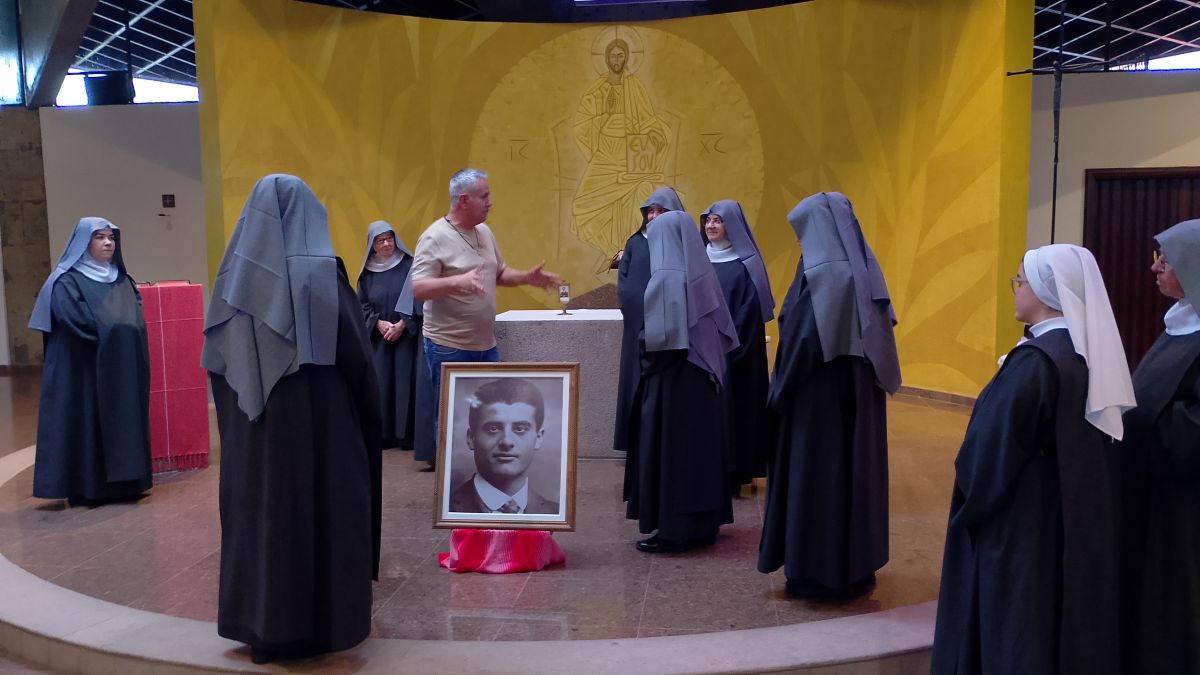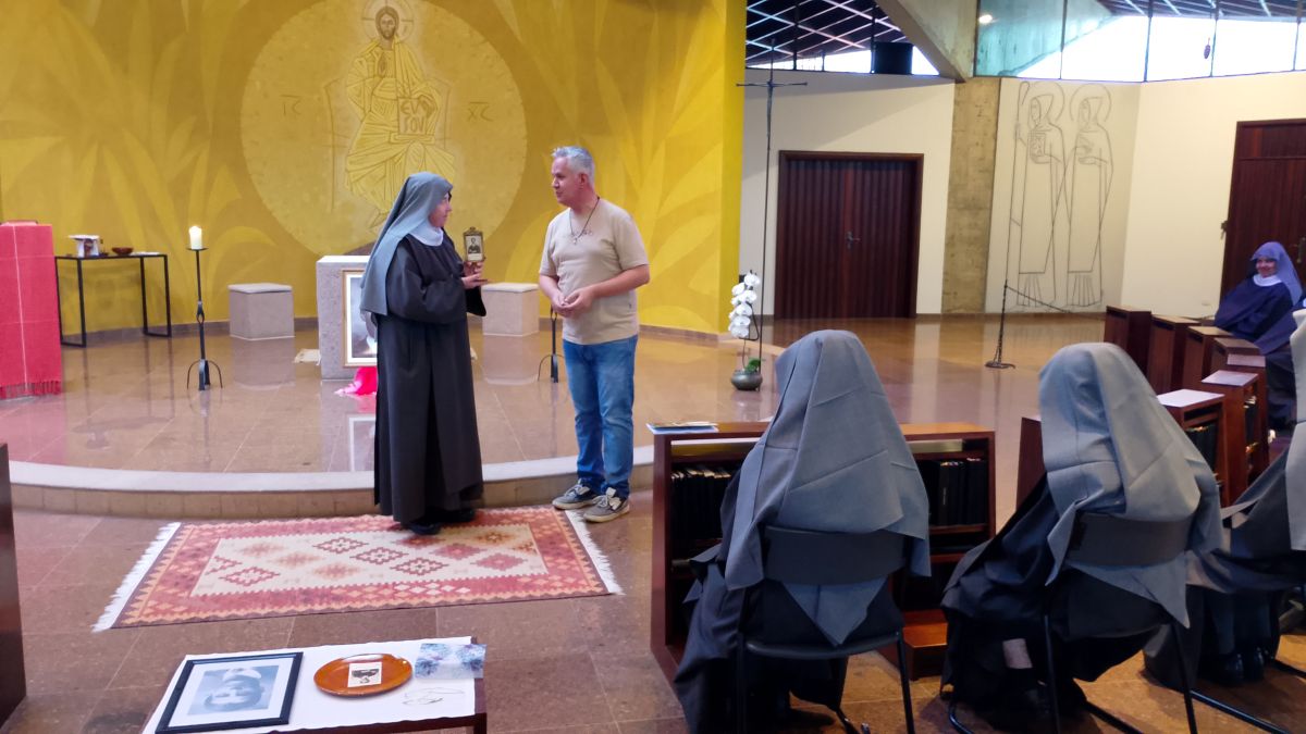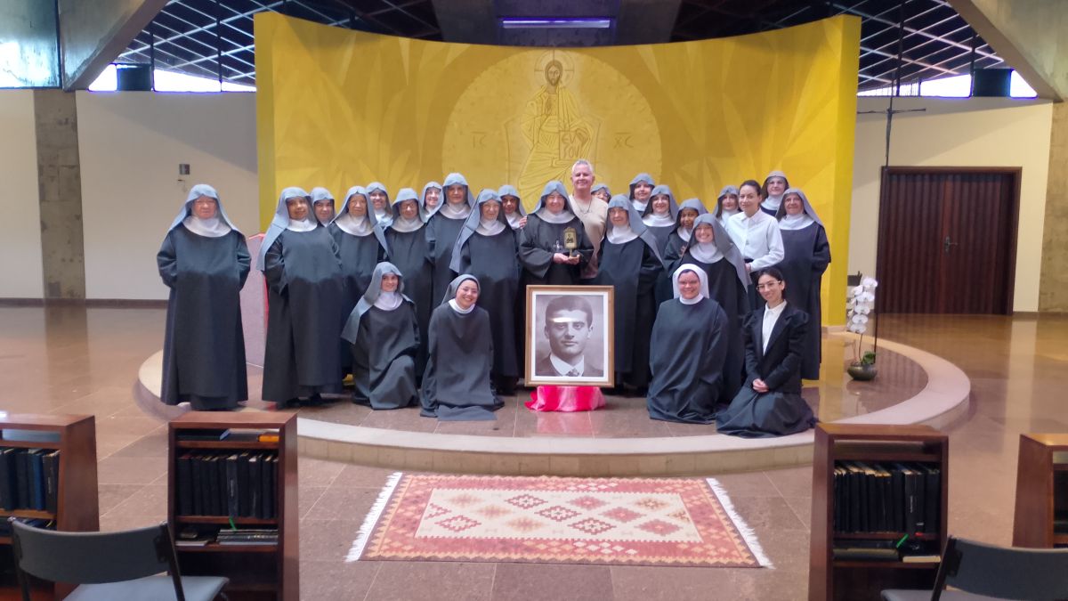 Nossa comunidade está em ação de graças pelo dom da relíquia de São Pier Giorgio Frassati! Na manhã do sábado 18 de outubro, logo após a missa conventual e a oração do Ofício de Terça, Eduardo Henrique da Silva entregou a lembrança à Madre Martha Lúcia,OSB, e deu uma conferência sobre Pier Giorgio a toda comunidade reunida na igreja abacial do Cristo Ressuscitado diante do altar e de um ícone do jovem santo.